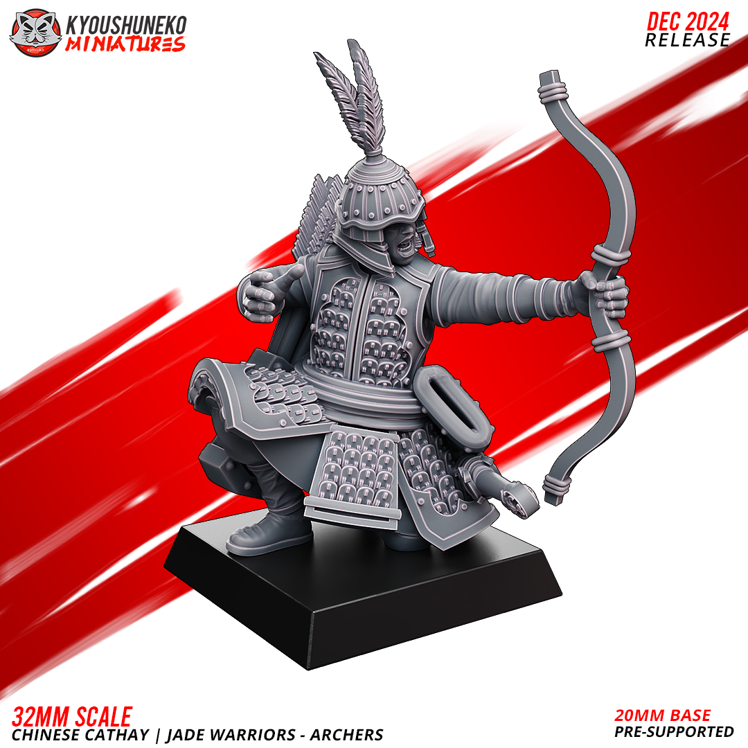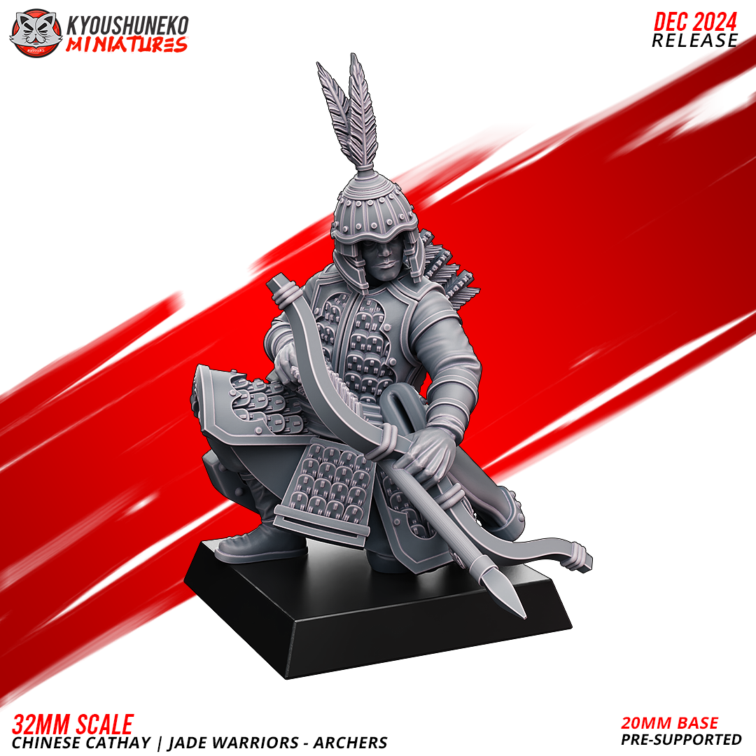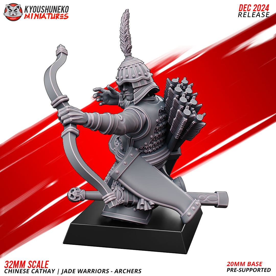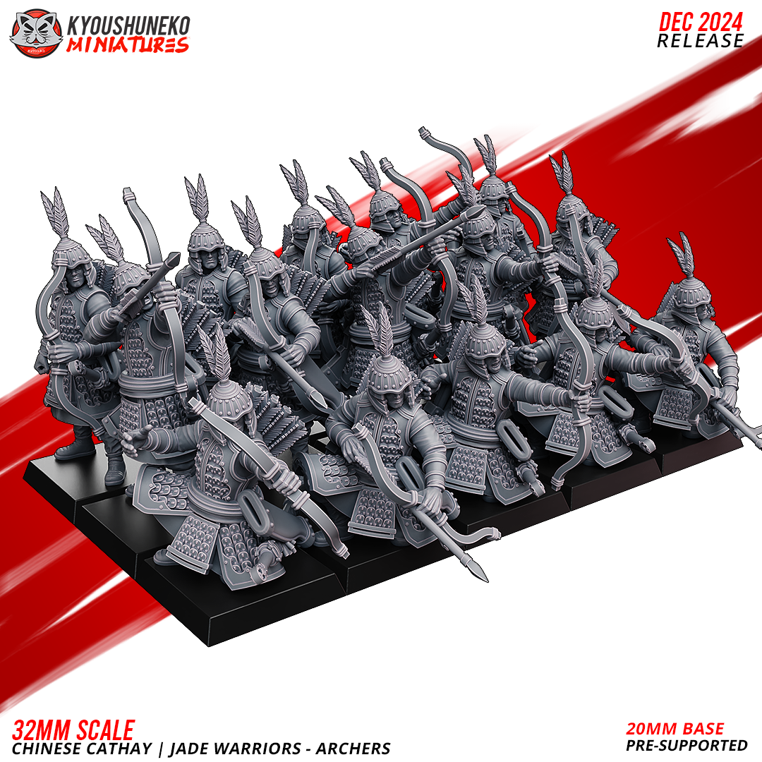Unidad de Infantería de Cathay para el juego de mesa Warhammer Fantasy y Old World. El producto contiene Arqueros de Jade, con posibilidad de distintos tamaños.