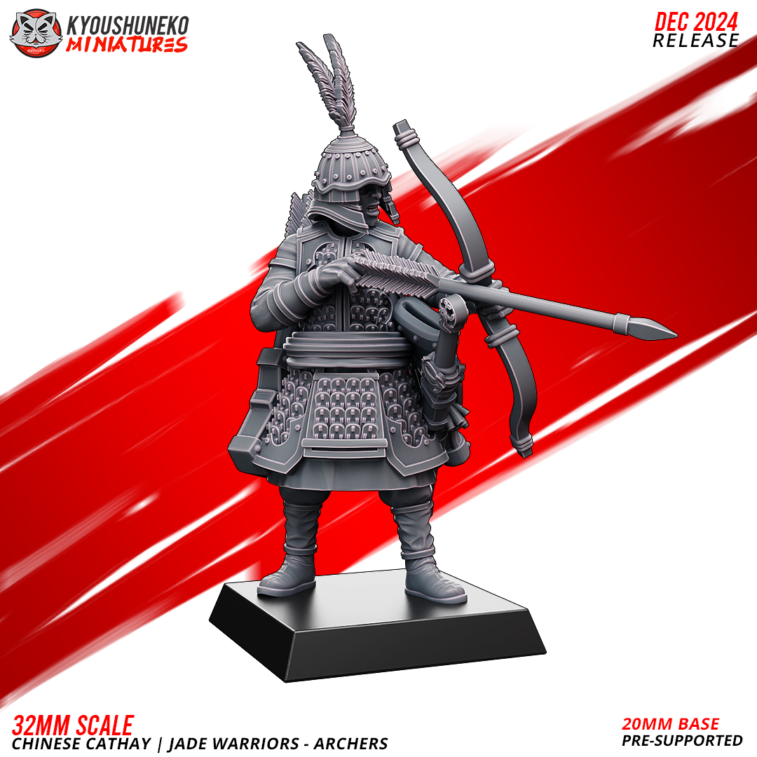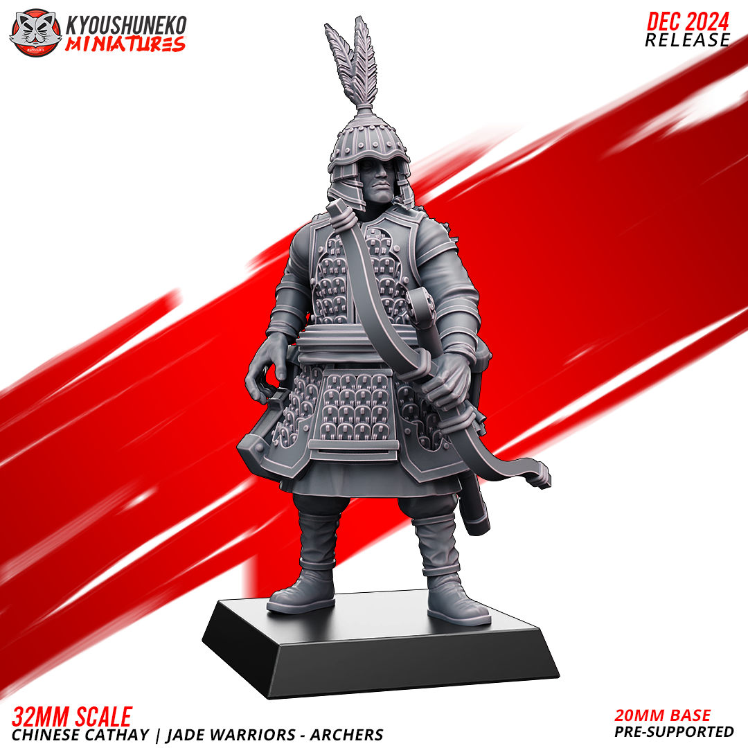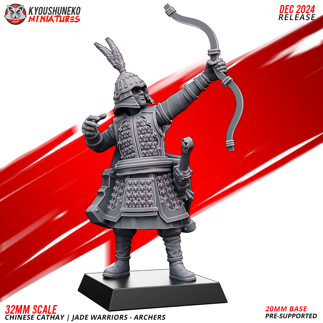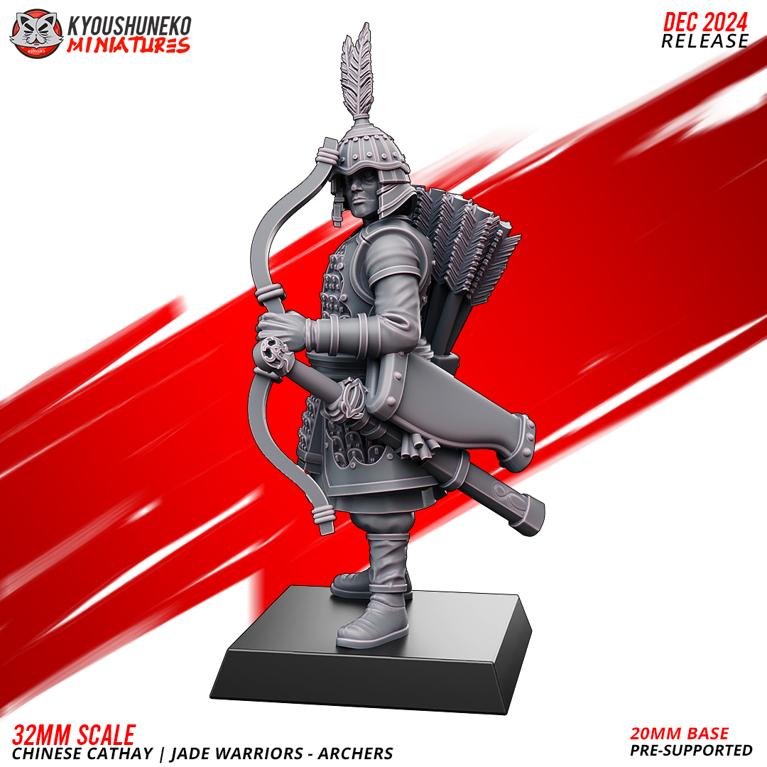 Unidad de Infantería de Cathay para el juego de mesa Warhammer Fantasy y Old World. El producto contiene Arqueros de Jade, con posibilidad de distintos tamaños.