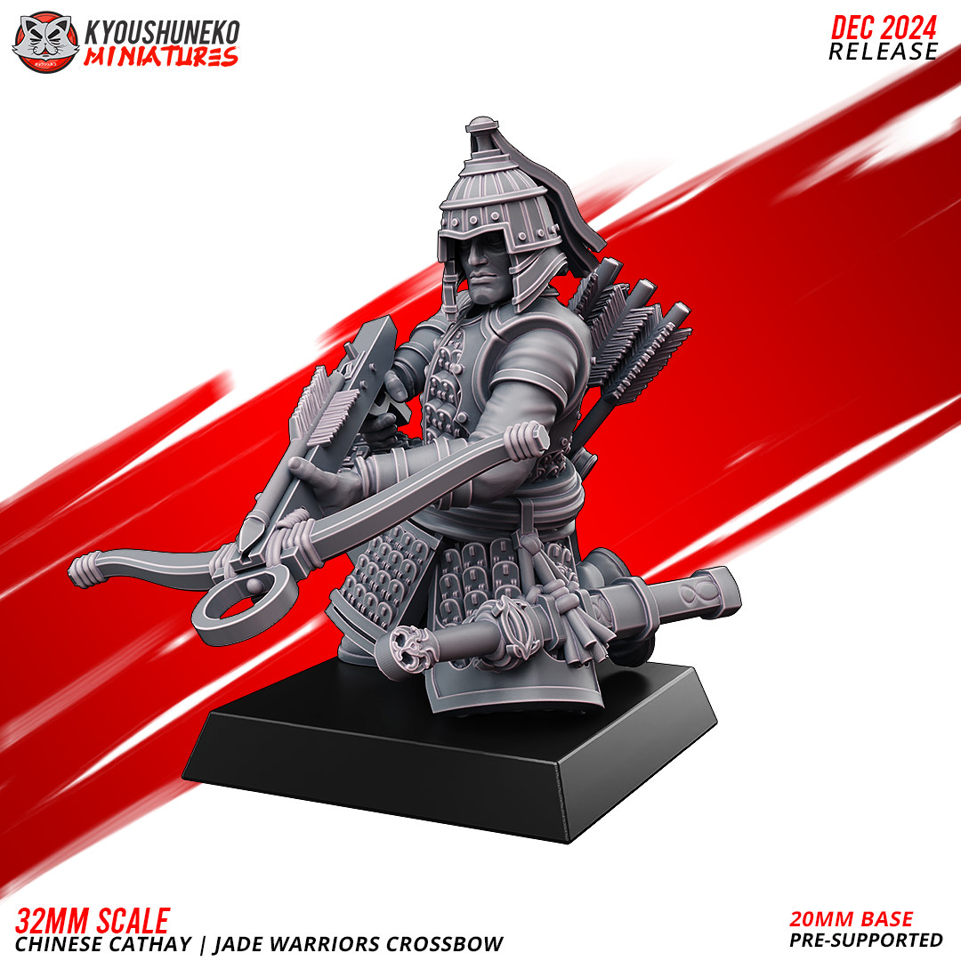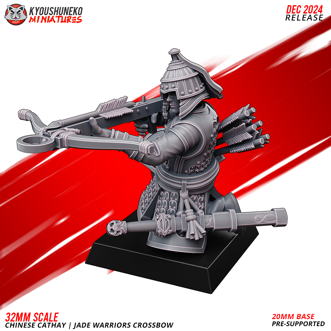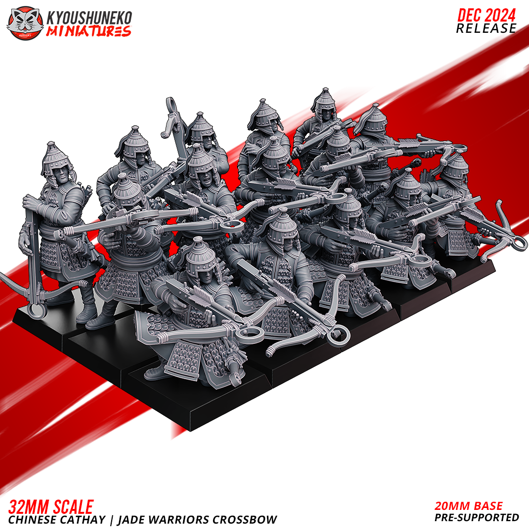 Unidad de Infantería de Cathay para el juego de mesa Warhammer Fantasy y Old World. El producto contiene Ballesteros de Jade, con posibilidad de distintos tamaños.