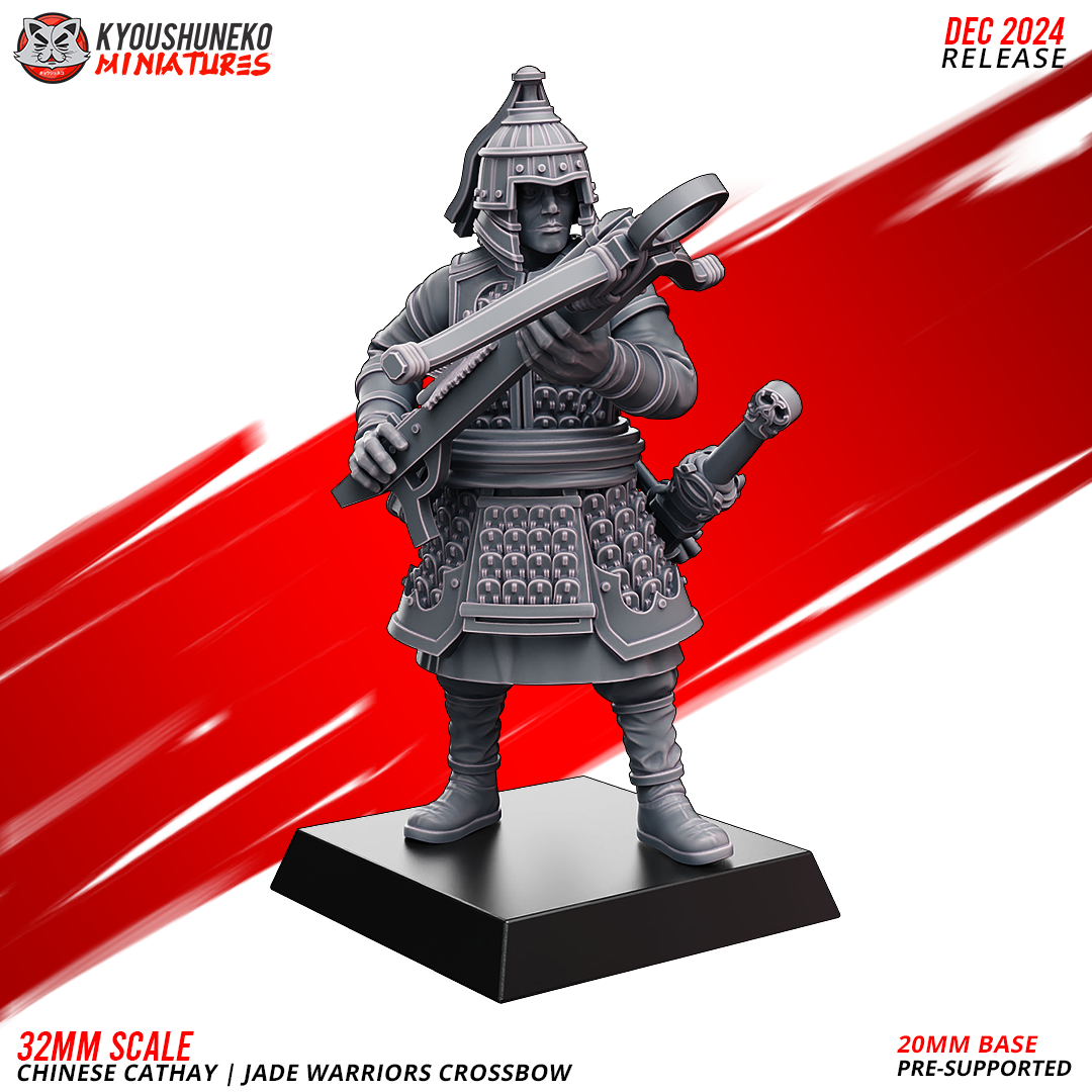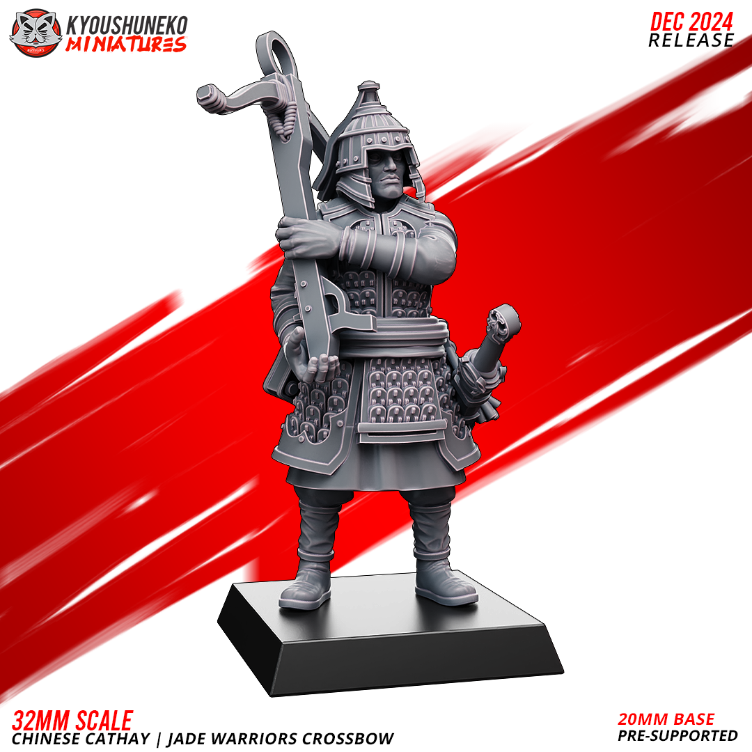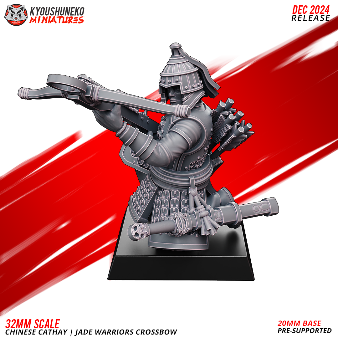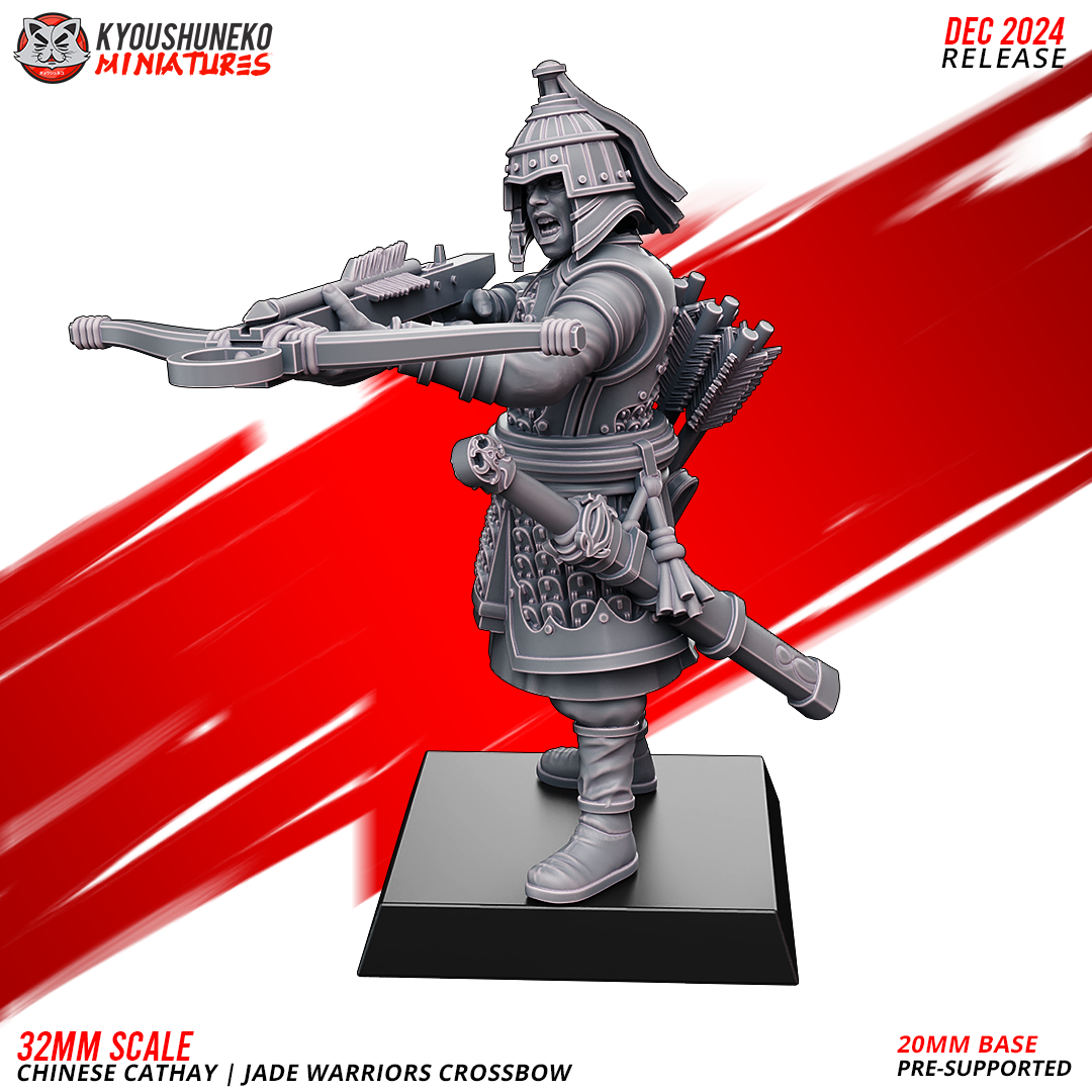 Unidad de Infantería de Cathay para el juego de mesa Warhammer Fantasy y Old World. El producto contiene Ballesteros de Jade, con posibilidad de distintos tamaños.