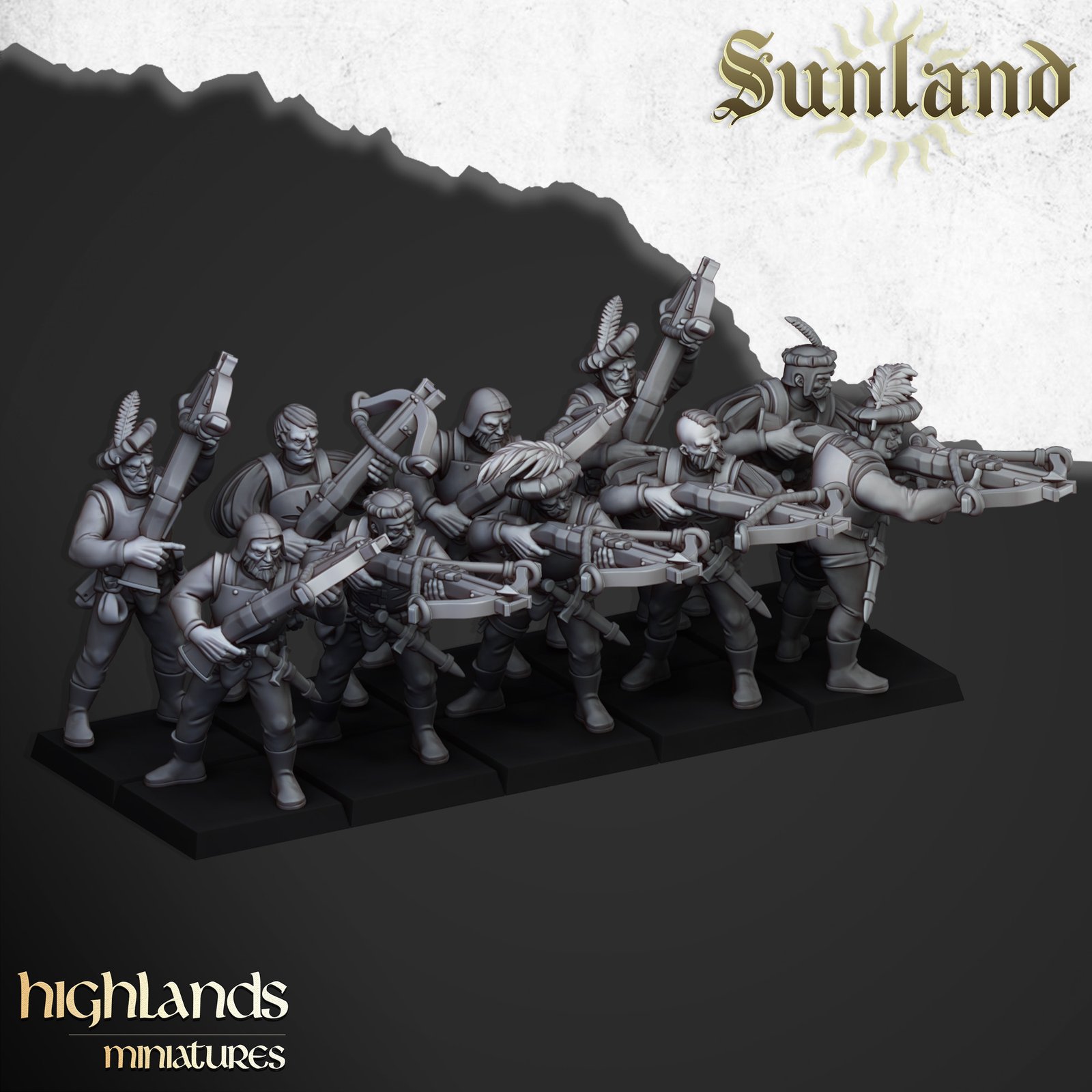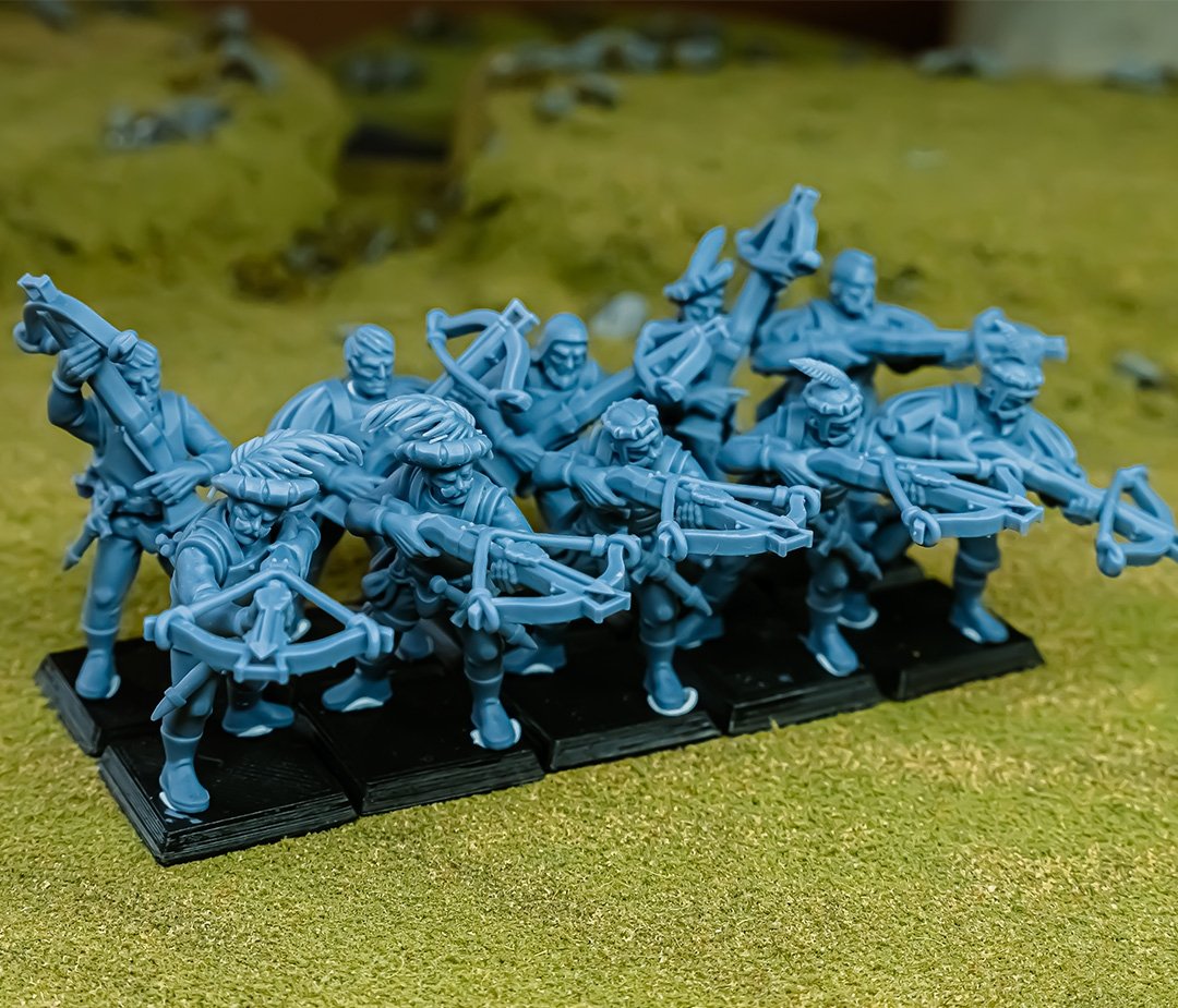 Unidad de Infantería del Imperio para el juego de mesa Warhammer Fantasy y Old World. El producto contiene 10 Miniaturas de Ballesteros del Imperio con posibilidad de distintos tamaños.