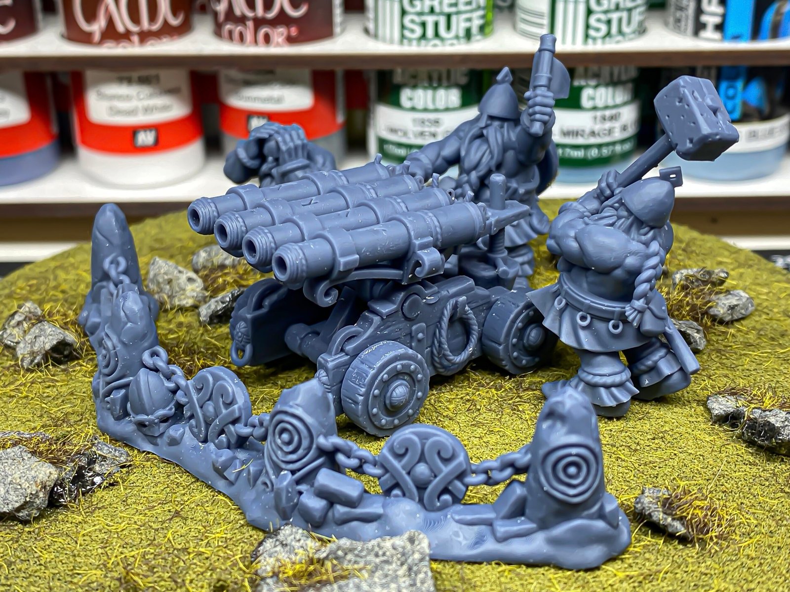 Unidad de Máquinas de Guerra de los Enanos para el juego de mesa Warhammer Fantasy y Old World. El producto contiene un Cañon Organo Enano con su tripulación incluida.