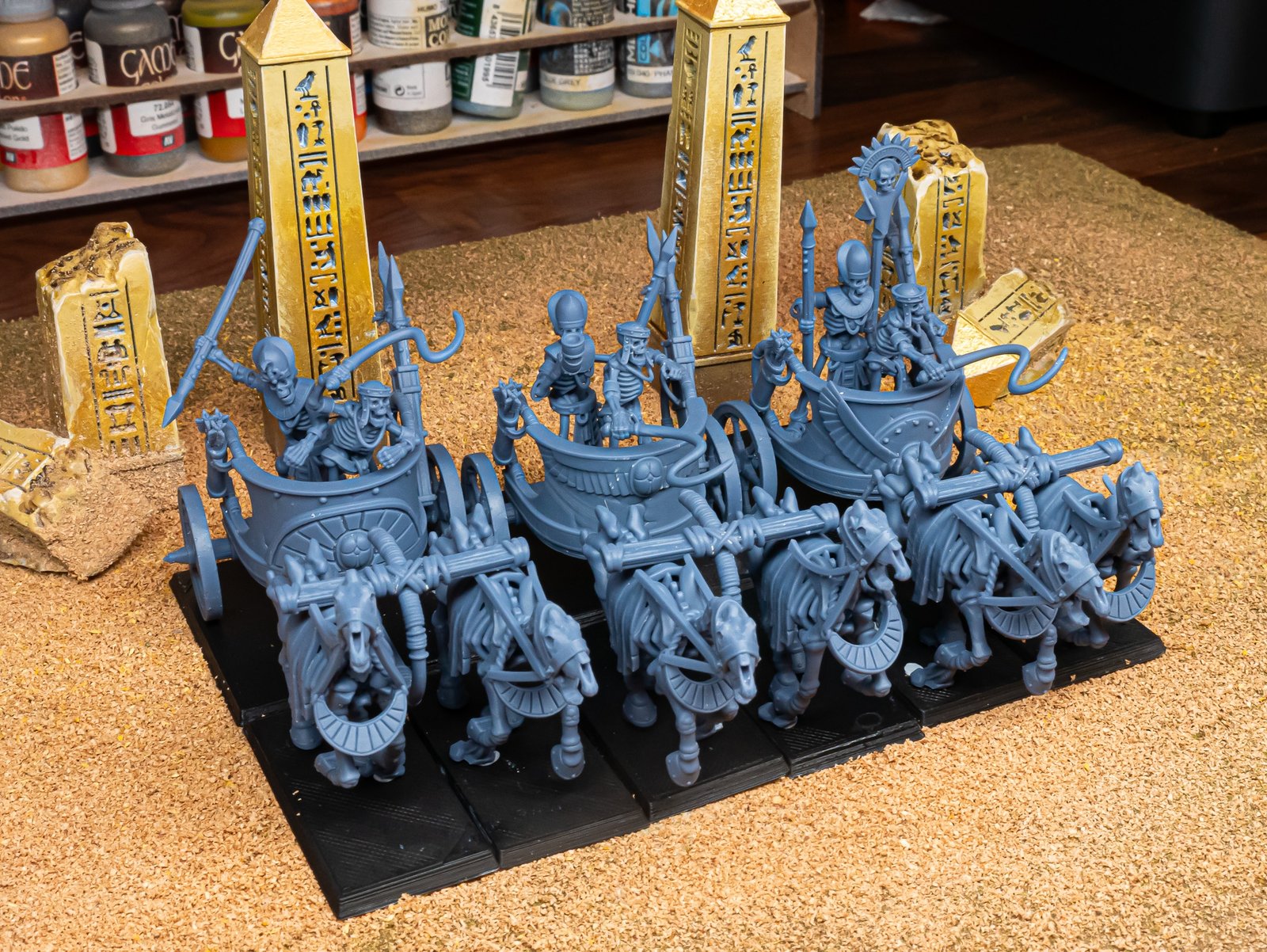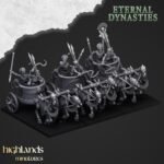 Unidad de Carros de los Reyes Funerarios para el juego de mesa Warhammer Fantasy y Old World. El producto contiene un Carro de Guerra de Khemri con su tripulación incluida y posibilidad de distintos tamaños.