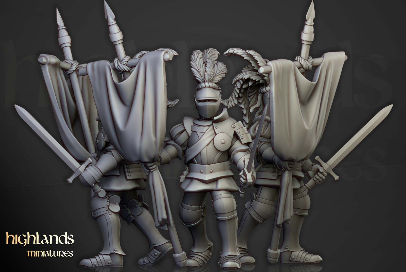 Unidad de Infantería del Imperio para el juego de mesa Warhammer Fantasy y Old World. El producto contiene un Grupo de Mando de Caballeros del Imperioco que consta, de capitán, estandarte y músico.