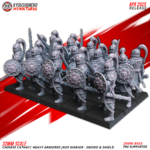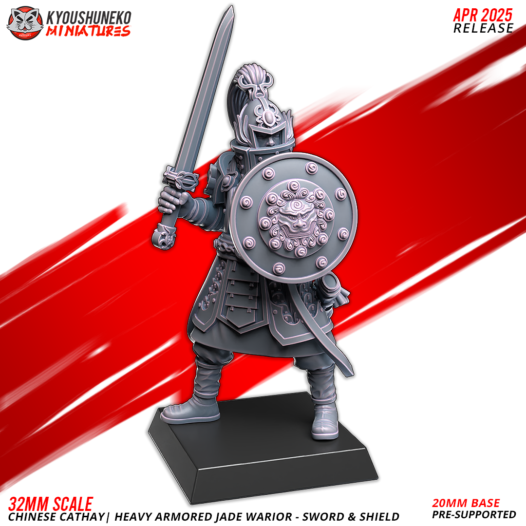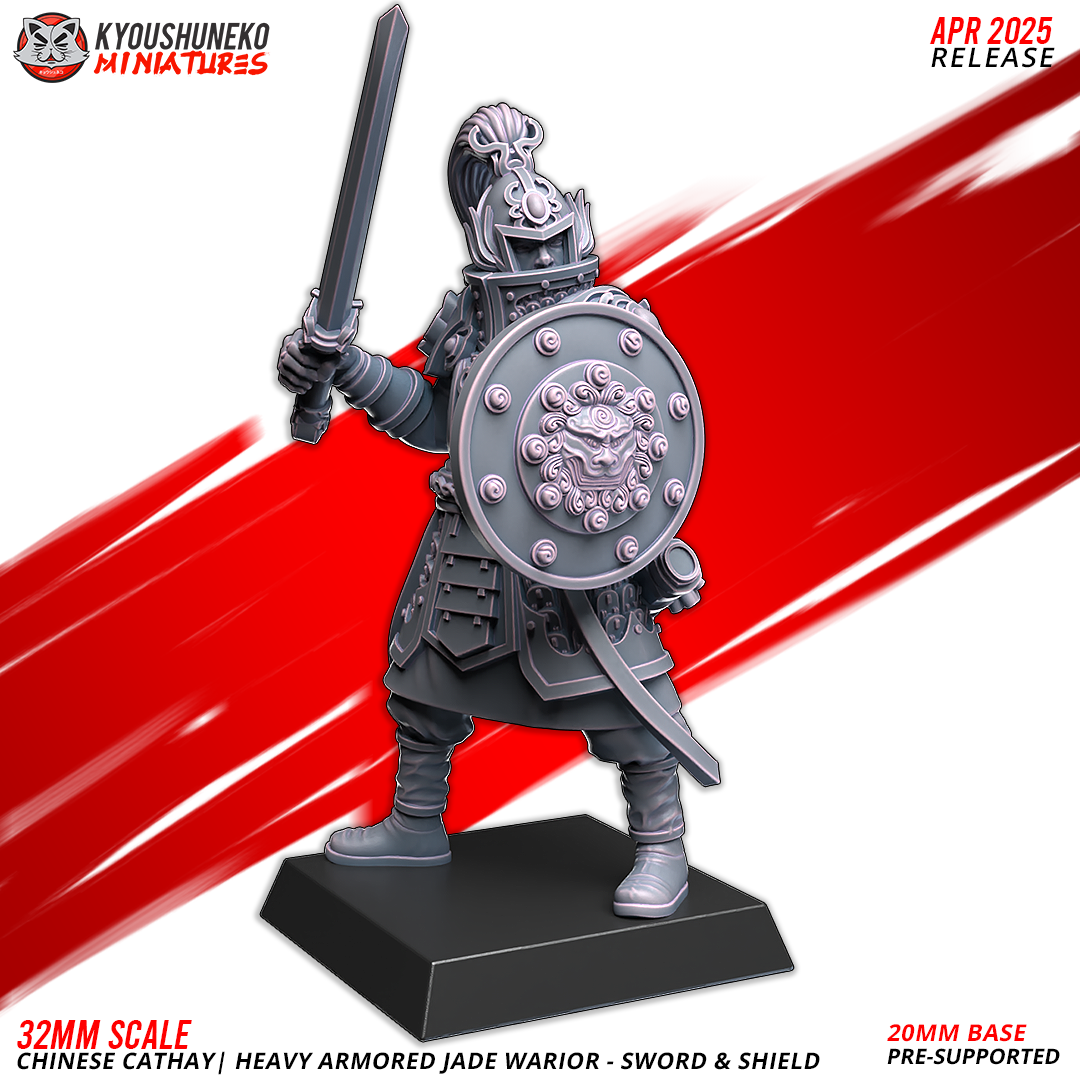 Unidad de Infantería de Cathay para el juego de mesa Warhammer Fantasy y Old World. El producto contiene 10 Miniaturas de Guerreros de Jade Pesados con posibilidad de distintos tamaños.
