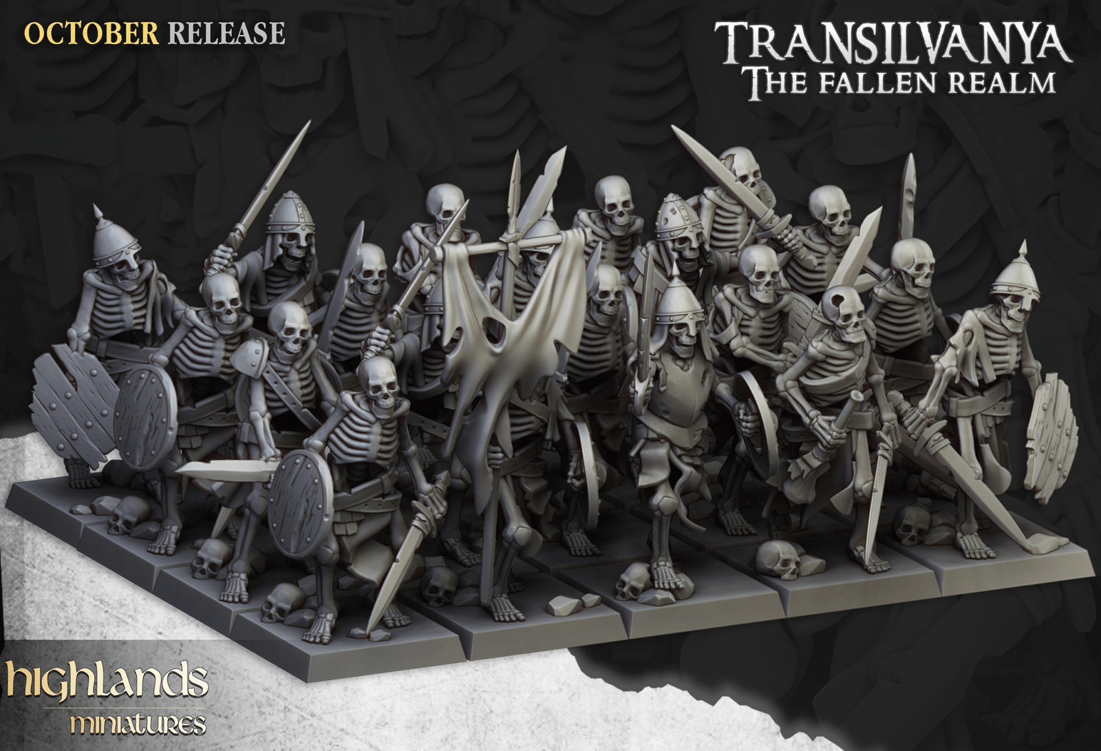 Unidad de Infantería de Condes Vampiros para el juego de mesa Warhammer Fantasy y Old World. El producto contiene 10 Miniaturas de Guerreros Esqueletos con posibilidad de distintos tamaños.