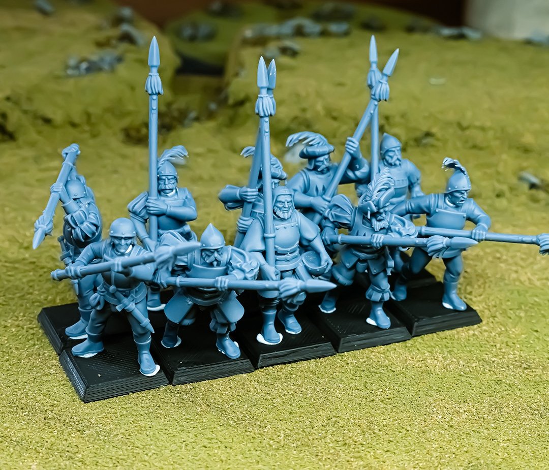 Unidad de Infantería del Imperio para el juego de mesa Warhammer Fantasy y Old World. El producto contiene 10 Miniaturas de Lanceros del Imperio con posibilidad de distintos tamaños.