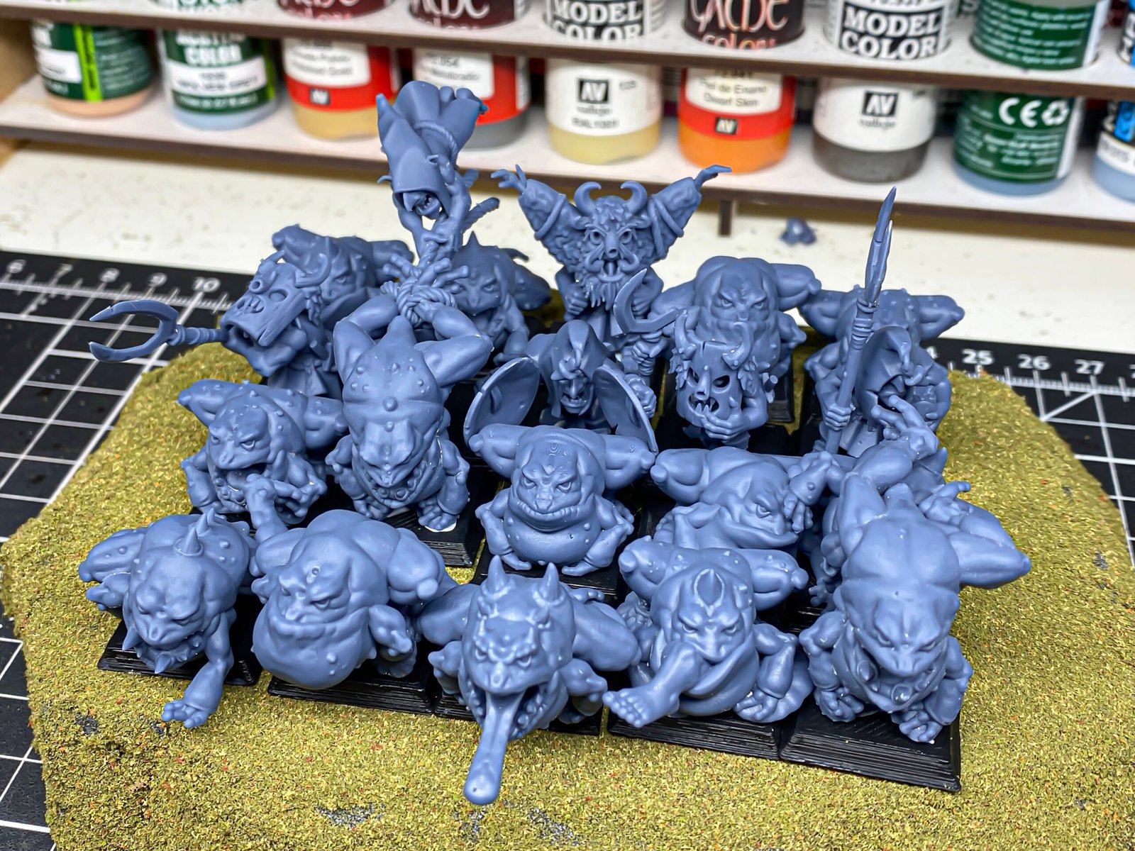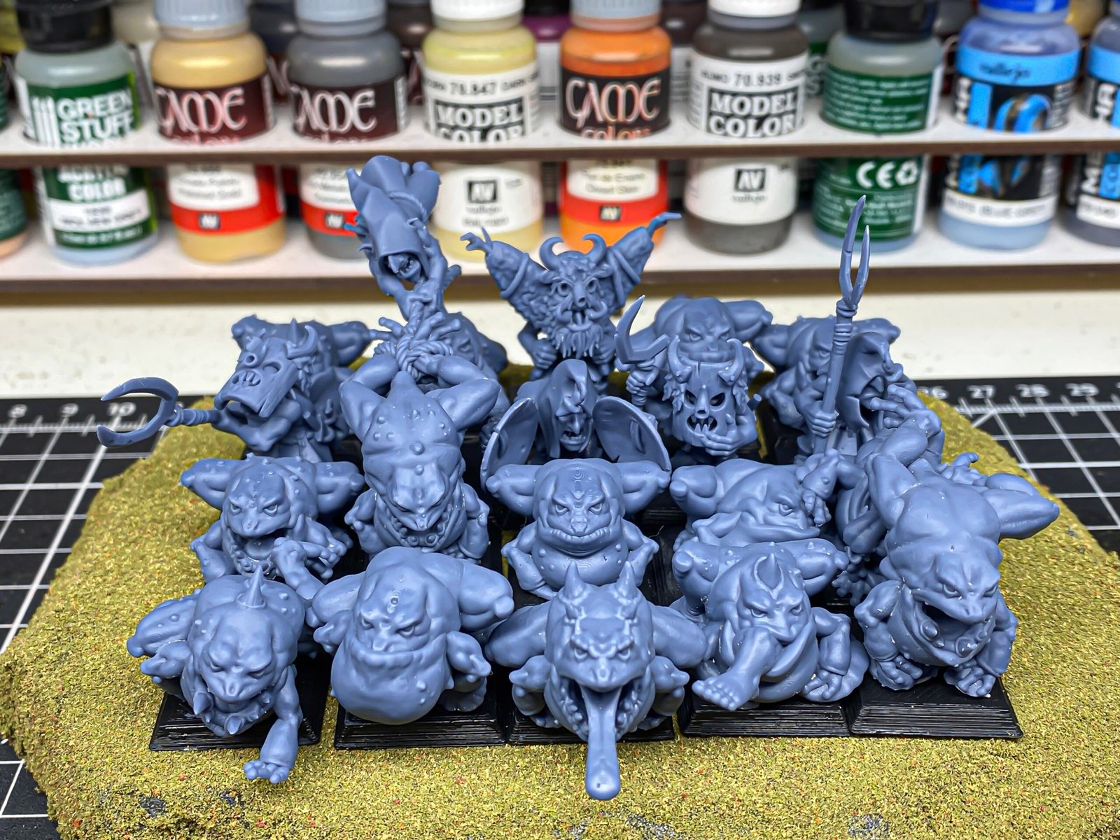 Unidad de Caballería de Orcos y Goblins para el juego de mesa Warhammer Fantasy y Old World. El producto contiene 10 Miniaturas de Rebaños de Garrapatos con posibilidad de distintos tamaños.
