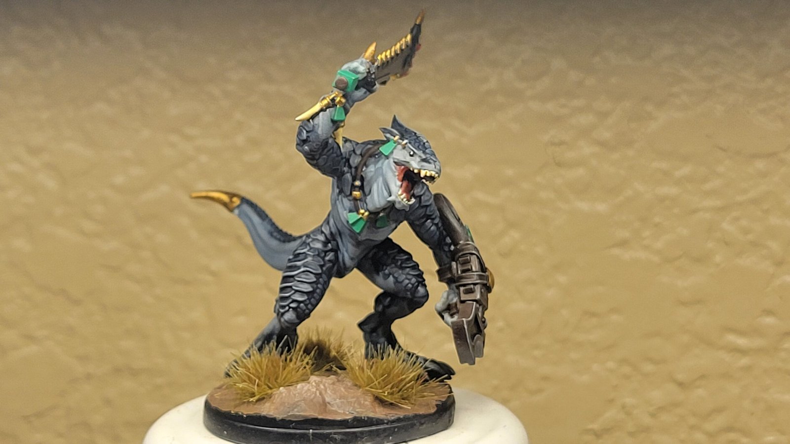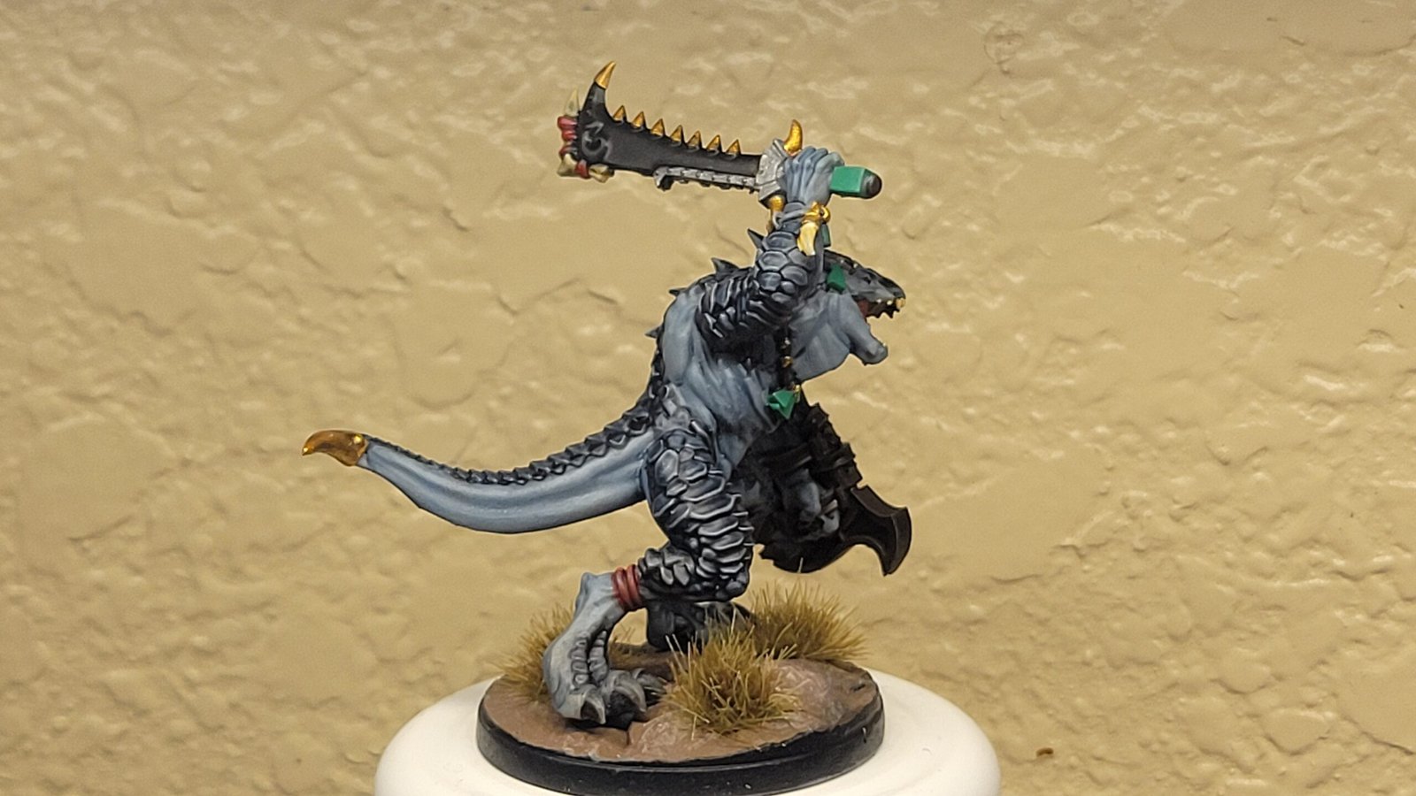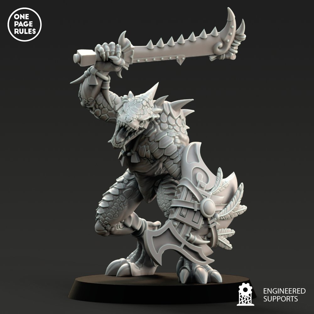 Unidad de Héroe y Personajes de Hombres Lagarto para el juego de mesa Warhammer Fantasy y Old World. El producto contiene un Estandarte Saurio.
